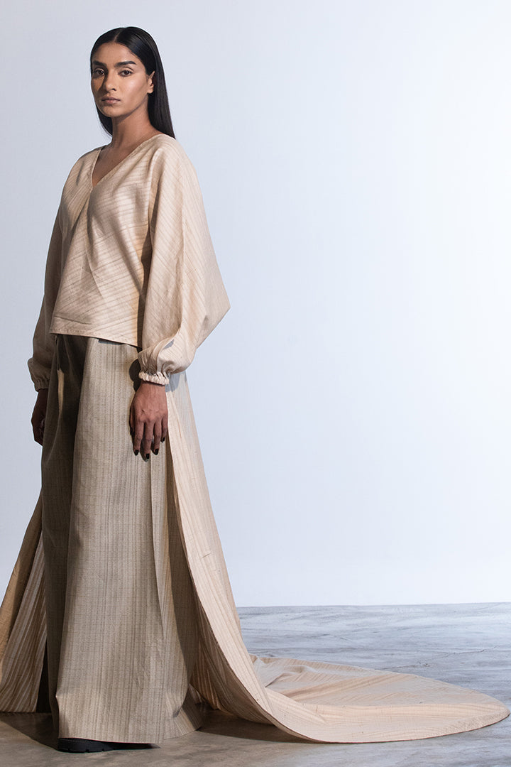 Asymmetrical dress, floor trail, round back, deep V neckline, single elastic cuff, batwing long sleeves.